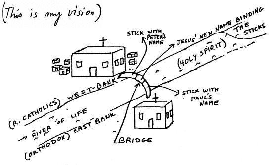 Vassula-of-My-Sacred-Heart; 1 would it please were I to say: Vassula-of-the-Pantocrator? 2 you are dedicated under My Name; I am One 3 and the Same, but men have parcelled Me out; he who sows division reaps a harvest of destruction; he who sows prejudice reaps a harvest of folly; have you not heard, that the fool folds his arms and eats his own flesh away? all the flesh that was covering them is gone and their breath too, nothing remains out of them but dry bones; My Names are Holy, 4 but men have patronized Me and have expelled Me from My Own House, My Own City and now from My Own Sanctuary: 5 they are oppressing Me and weighing heavily on Me, overweening with pride they are content to live in a desert; But I mean, in these coming days to display the Holiness of My Great Name, which is, because of your division, profaned; I tell you, daughter, do you see how your people are living undisturbed and in an appalling lethargy when it comes to work for unity? 6 I will allow no more of this; I am going to reach out My Hand even to the remotest parts of your nation and overthrow these traders 7 that hinder My people to unite; I have raised you to be a sign of unity, a sign of My Mercy, a sign of My Power, but the passions of their ostentatious pride has turned them blind; today I can say: "let their bones burn" and take revenge; I can widow your nation, but in My Mercy and for the sake of My Love I will raise from the East at least one, who will say to his brother: 8 "come and tread on my ground; come and eat from my table, come and drink with me; my vats are overflowing with new wine; let us pasture our lambs together and make an Eden of our pastures; our God! see what our hands have made out of Your Sanctuary!" My House in the West is being plundered; I had asked them to assemble under Peter, 9 but they have not understood and are doing the contrary; many from within that House are saying: "why is it that we have to have a guide, 10 especially this guide?" I had warned you that cardinals will turn against cardinals, bishops against bishops and priests against priests; I selected Peter to feed and guard My lambs but the spirit of rebellion, thriving now, has reached its peak of rebellion; this was the great Tribulation I was warning you of; 11 My House in the West is being plundered, but, the wind from the East will rise and together with My Breath will strip the plunderer; many members of your nation object to My Call of Unity and have accustomed their steps to walk their own way; they call themselves rich, but then, where are their riches? .... "how is it you have become a degenerate vine? can you say that you have not sinned? is there a single place where you have not sinned? you, the friend of My Saints! the child of My Mother! why, why have you become so obstinate? what are your endless ceremonies to Me when you give Me praise by lip-service? yes, you have kept My Tradition and this is why the sword will not come to you, yet you put aside My Two Greatest Commandments and do not follow them; why do you separate Tradition from Commandment? 12 should you cover yourself with myrrh and incense I should still detect the stain of your guilt; open your mouth now and let Me feed you so that you devour life; do not say: "we will go our own way; return to Me and acknowledge your guilt!" and you, daughter, shout My Message aloud and prophesy, say: I know all about My House in the West bank, near the River of Life and I know too who in this House remained loyal to Me; daughter, what do you see outside this House? I see a lion prowling outside that House, and eager to enter Your House from a side window. yes; the lion left its lair; daughter, a destructive spirit is roaming; angel follows close on angel, to warn you all and tell you that My City in the West bank will be stormed by the ravager and with great violence that is, to oppose and contradict My Law, My Tradition and My Divinity; the whole country shall become a horror; your holy ones, My messengers and My prophets will be hindered to go on with their work .... and over you will spread a heavy darkness while the Enemy, who is a scholar, will be banishing My Perpetual Sacrifice, thinking his acts go by unnoticed with his secret sins; My Hand will descend upon him suddenly, destroying him altogether; that Night had been foretold in the Scriptures; but he, together with others, have put their oath in the Beast's mouth joyfully, honouring only the Beast for having given them its power; woe to the worshippers of the Beast! they will be moaning and bemoaning; now, daughter, what do you see on the other side of the bank, My House of the East? I do not see any City, and the land is sandy and flat as in a desert; but I also see a green shoot springing from this desert. listen and write: glory will shine from the Eastern bank; that is why I say to the House of the West: turn your eyes towards the East; do not weep bitterly over the Apostasy and the destruction of your House; do not panic, for tomorrow you will eat and drink together with My shoot from the Eastern bank; My Spirit will bring you together; have you not heard that the East and West will be one kingdom? have you not heard that I shall settle for one date? 13 I am going to reach out My Hand and carve on a stick the words: West bank, House of Peter and all those who are loyal to him; then, on another stick I will carve: East bank, House of Paul, together with all those who are loyal to him; and when the members of the two Houses will say: "Lord, tell us what you mean now", I will say to them: "I will take the stick on which I carved Paul's name together with all those who are loyal to him and put the stick of Peter and his loyal ones, as one; I shall make one stick out of the two and I shall hold them as one; I shall bind them together with My New Name; this will be the bridge between the West and the East; My Holy Name will bind the bridge, so that you will exchange your possessions across this